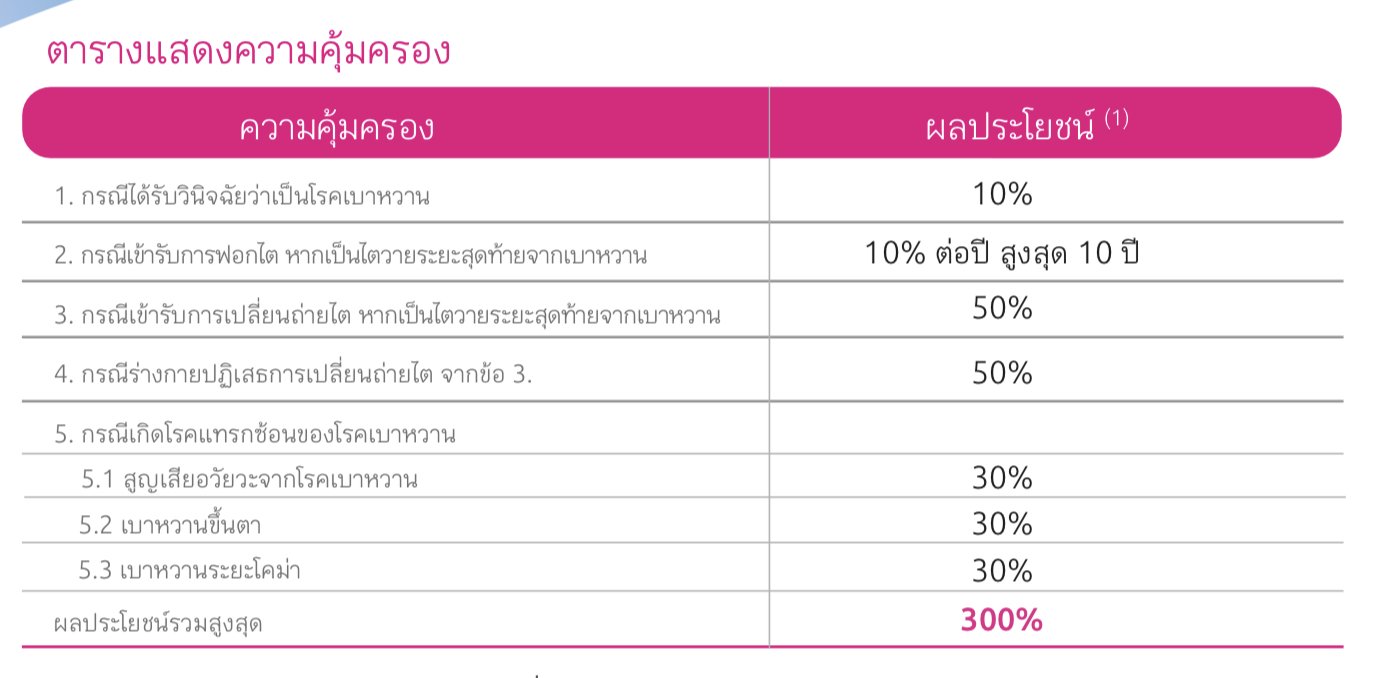 5. ผลประโยชน์กรณีเกิดโรคแทรกซ้อนของโรคเบาหวาน กรณีที่ผู้เอาประกันภัยได้รับการวินิจฉัยจากแพทย์ว่าเกิดโรคแทรกซ้อนของโรคเบาหวานบริษัทจะจ่ายผลประโยชน์กรณีเกิดโรคแทรกซ้อนของโรคเบาหวาน ตามรายละเอียดความคุ้มครองดังนี้