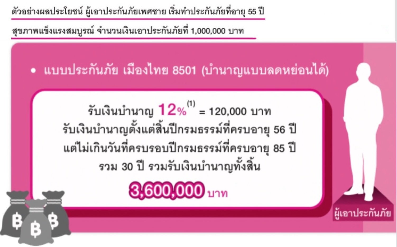 เงินบำนาญต่อปี คำนวณจากเงินเอาประกัน 1,000,000 x 12% = 120,000 (เฉลี่ยเดือนละ 10,000)
