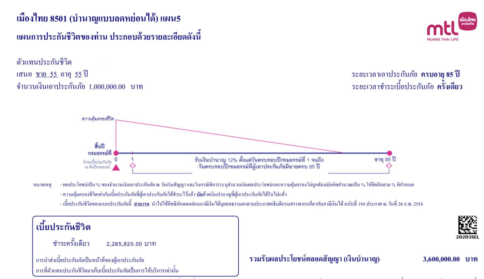 ผู้ทำประกันเป็นชายอายุ 55 ปี ทำแบบ 8501 บำนาญลดหย่อนได้ จำนวนเงินเอาประกัน 1,000,000 บาท