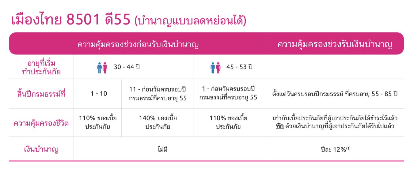 ผลประโยชน์ความคุ้มครองเมืองไทย8501 ดี55(บำนาญแบบลดหย่อนได้)