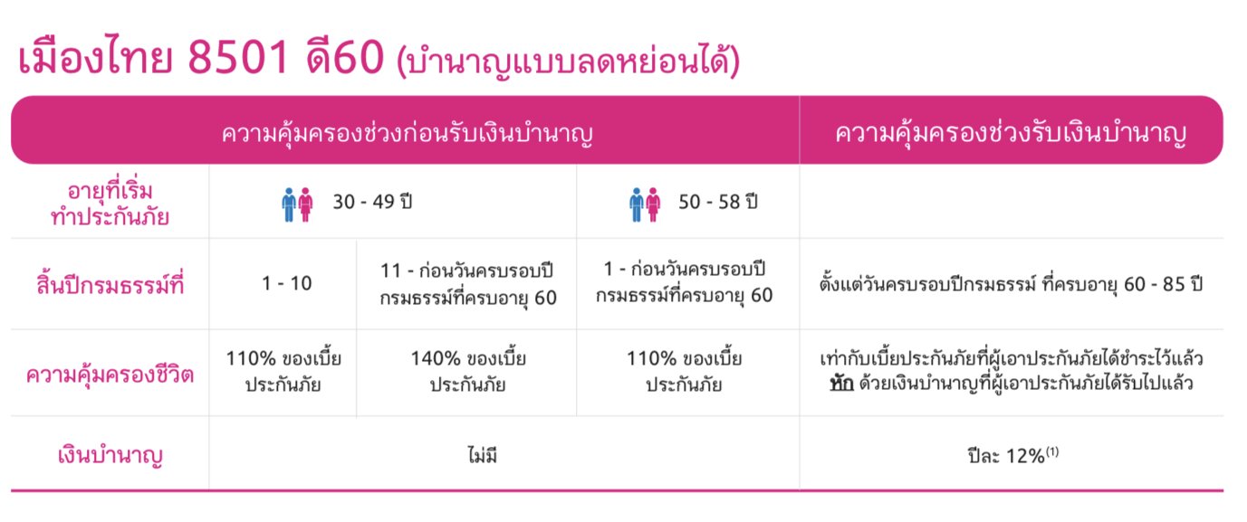 ผลประโยชน์ความคุ้มครองเมืองไทย8501 ดี60(บำนาญแบบลดหย่อนได้)