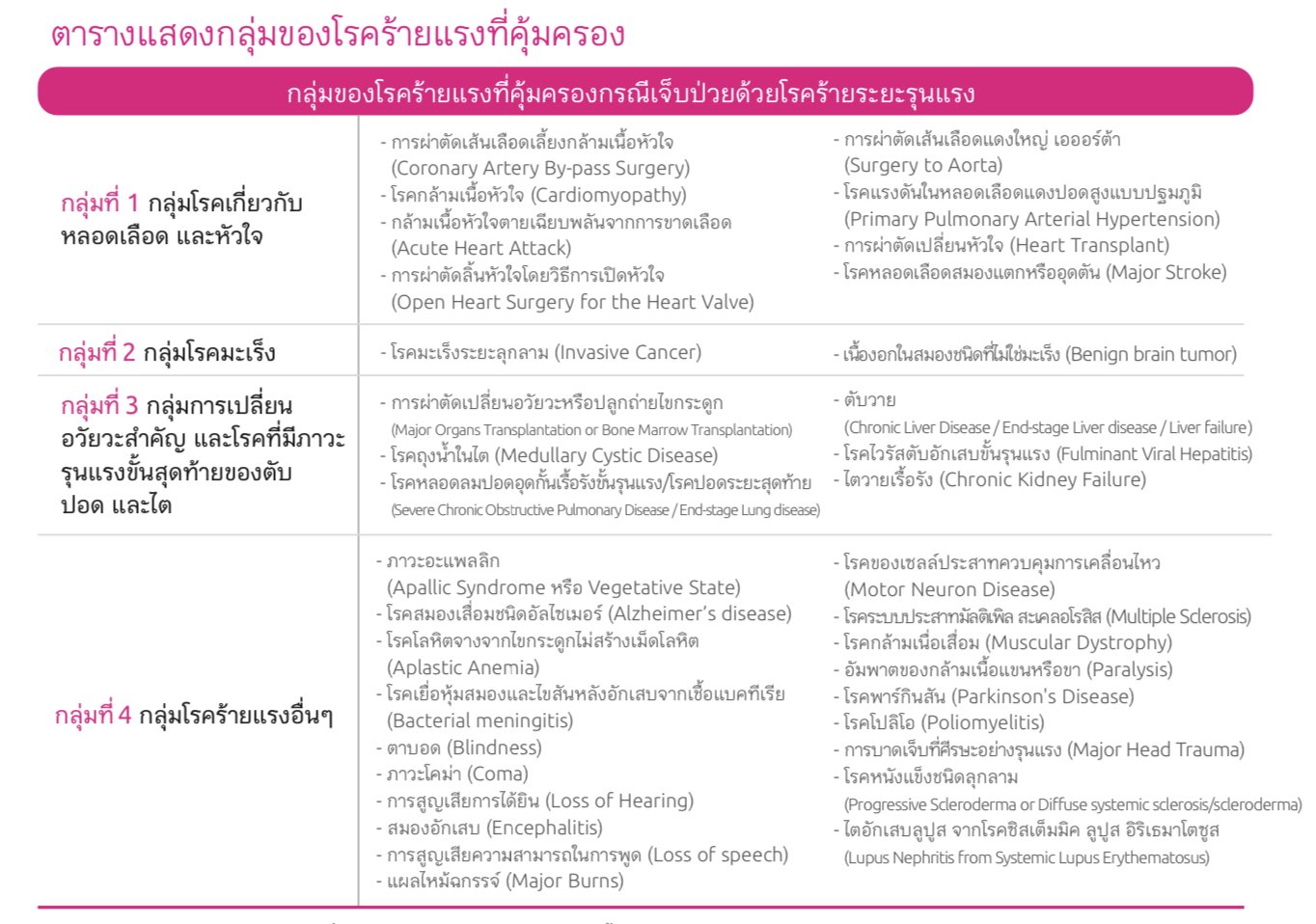1. ความคุ้มครองของกลุ่มของโรคร้ายแรงที่มีการจ่ายจำนวนเงินเอาประกันภัยเนื่องจากการเจ็บป่วยหรือการผ่าตัดที่มีรายชื่อโรคนั้นอยู่จะสิ้นสุดลงโดยผู้เอาประกันภัยยังได้รับความคุ้มครองในโรคที่อยู่ในกลุ่มของโรคร้ายแรงกลุ่มอื่น ๆ