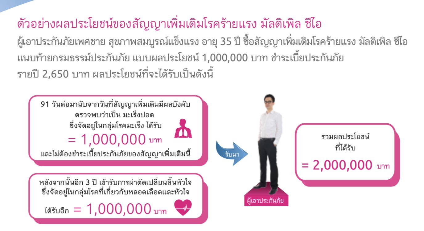 ในขณะที่สัญญาเพิ่มเติมยังมีผลบังคับผู้เอาประกันภัยจะได้รับความคุ้มครองตามเงื่อนไขข้อบังคับของสัญญาเพิ่มเติมนี้เมื่อผู้เอาประกันภัยได้รับการวินิจฉัยว่าเจ็บป่วยด้วยโรคร้ายแรงหรือได้รับการผ่าตัดตามความคุ้มครองโรคร้ายแรงตามคำจำกัดความของโรคที่ให้ไว้ในสัญญาเพิ่มเติมนี้ทั้งนี้หลังจากที่บริษัทได้รับหลักฐานทางการแพทย์ของการเจ็บป่วยหรือการผ่าตัดเพียงพอที่จะสามารถวินิจฉัยได้ บริษัทฯจะจ่ายเงินตามจำนวนเงินเอาประกันภัยของสัญญาเพิ่มเติมนี้ให้แก่ผู้เอาประกันภัยหลังจากที่บริษัทได้ทำการจ่ายจำนวนเงินเอาประกันภัยให้แก่ผู้เอาประกันภัยครั้งที่ 1 แล้วผู้เอาประกันภัยไม่ต้องจ่ายเบี้ยประกันภัยของสัญญาเพิ่มเติมนี้อีก สัญญาเพิ่มเติมฉบับนี้จะมีผลบังคับและให้ความคุ้มครองตามเงื่อนไขดังนี้