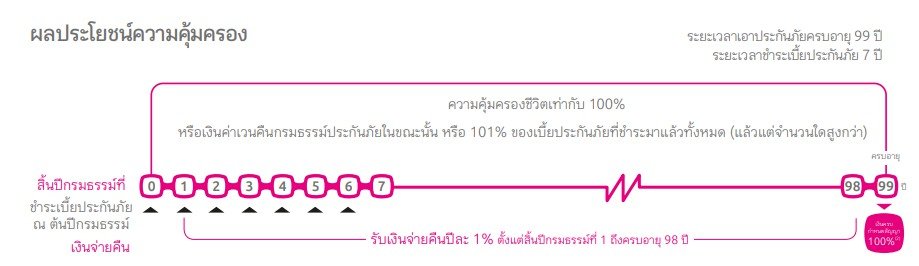 และได้รับความคุ้มครองเท่ากับทุนประกัน แล้วเพิ่มความคุ้มครองขึ้นตามเวลาที่มีการชำระเบี้ยเพิ่ม เป็น 101% ของเบี้ยที่เราจ่ายไปแล้วทั้งหมด