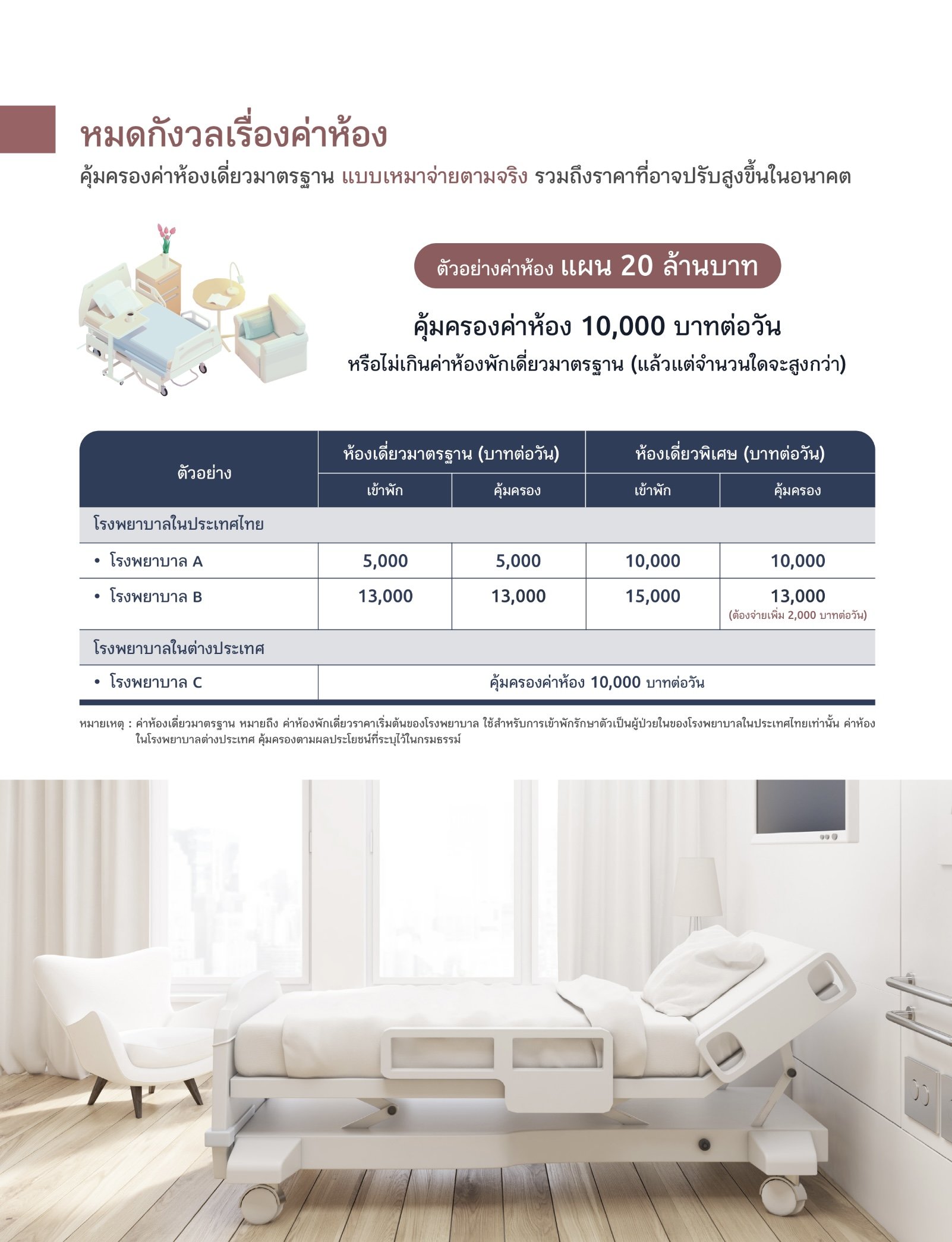 คุ้มครองผู้ป่วยใน ให้ความคุ้มครองค่ารักษาพยาบาลในฐานะผู้ป่วยใน ทั้งค่าห้อง ค่าอาหาร ค่าห้องผ่าตัดและอุปกรณ์ ค่าปลูกถ่ายอวัยวะ ค่ารักษาทางจิตเวช เป็นต้น(ค่ารักษาทางจิตเวช กรณีเลือกความคุ้มครองแผน 3 หรือ 4)