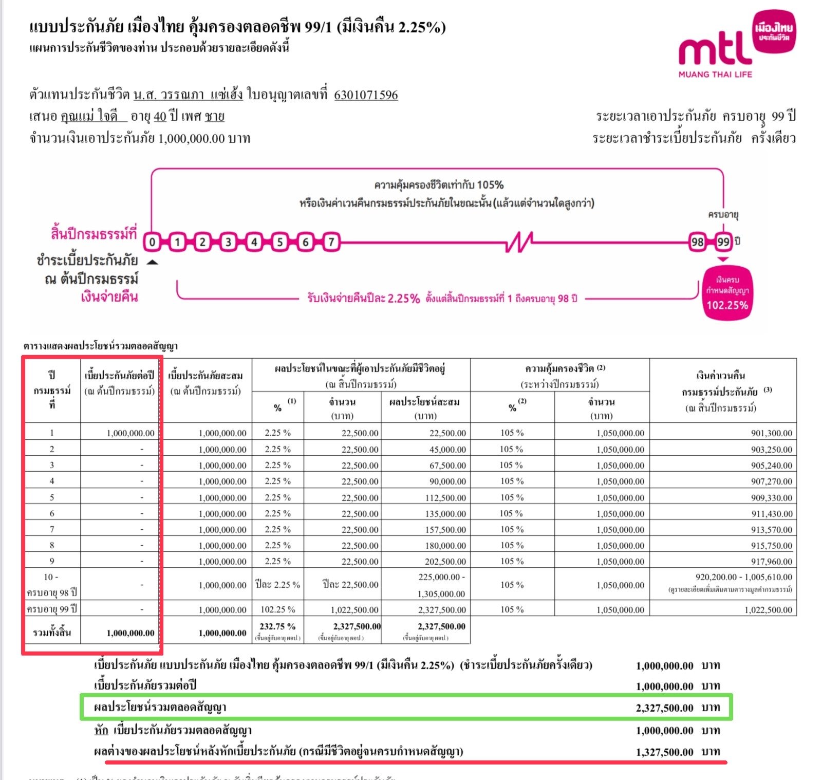 แบบประกันเมืองไทย 99/1 (มีเงินคืนทุกปี) เหมาะสำหรับคนที่ต้องการจจะเก็บเงินในที่ปลอดภัย และได้เงินปันผล เหมือนเช่นฝากธนาคาร ซึ่งผลิตภัณฑ์ตัวนี้ตอบโจทย์ที่สุด เพียงลูกค้านำเงินมาฝากเพียง 1ล้านบาท ก็จะได้รับเงินปันผลตั้งแต่ปีแรก ปีละ 22,500 บาท หรือฝากครั้งเดียว 10ล้านบาท ก็รับไปเลย ปีละ 225,000 บาท และรับไปทุกปีจนอายุครบ 98 ปี ปีสุดท้าย 99 รับเงินก้อน 105%จากทุนประกัน ตัวนี้ไม่ว่าลูกค้า จะอยู่ไม่ถึง 99 ปี ก็สามารถส่งมอบเป็นมรดกต่อให้คนข้างหลังได้